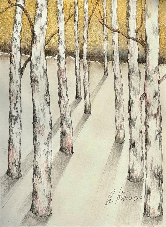 Leuchtend weiße Birken, lange Schatten und strahlendes Licht prägen dieses stimmungsvolle Aquarellmotiv. Im Mittelpunkt stehen die Wirkung des Lichts auf der schneeweißen Fläche, die räumliche Tiefe durch Negativbetonung der Baumstämme und die Komposition, die dem Bild Perspektive und raum verleiht. Die Hintergrundfarbe, insbesondere der Himmel, beeinflusst die Stimmung des Bildes maßgeblich. Ich habe exemplarisch mit Gold gearbeitet; im Kurs experimentieren wir mit unterschiedliche Farbvarianten.